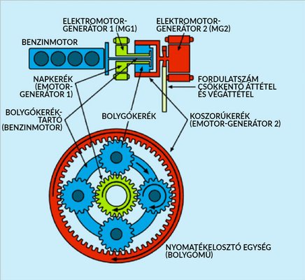 Ehhez még hozzájön a vezérlés, ami folyamatosan beleavatkozik a rendszerbe, például egy előre meghatározott sebességig nem engedi egy bizonyos fordulatszám fölé pörögni a benzinmotort. Mindebből adódik, hogy a Prius nyomatéka nem a fordulatszámmal változik, hanem az autó sebességével. És, ha még ez sem lenne elég, tudtommal az utolsó két generációs Priusban a hajtó elektromotort összeépítik egy fordulatszám csökkentő áttétellel (ami egyébként szintén bolygómű), és így kötik be a teljesítmény- és nyomatékelosztást végző központi bolygóműbe. Ez azt jelenti, hogy bár a villanymotor nyomatéka önmagában ugyan csupán 163 Nm, de ennek legalább a kétszerese jut be a rendszerbe. (A pontos áttétel nem ismert.) No, most akkor mennyivel is számoljunk?