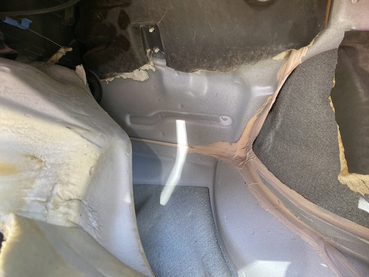 Az első lépés a kitakarított beltér után szivacs szigetelőelemek visszafektetése volt, viszont amint megnyomtam a taposón lévő, korábban ki nem szerelt szivacsbetétet, ömleni kezdett belőle a víz. Korábban lyukas volt itt a lemez, szárogattuk is eleget az autót, de azt gondoltuk, beázott, hiszen a lyukat befoltoztuk. Lebontottuk az tűzfal feletti vízelvezető és ablakmosó mechanikát takaró műanyaglemezt, hogy megtudjuk, honnan jut be a víz.