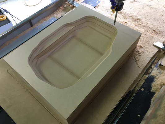Hogyan lett ez ízlésesen tálalva a végén szalagozás nélkül? Gyakorló CNC-s elfoglaltságként csináltam két tokozást szálerősített műanyagból. Költséghatékonyságból megmaradt préselt lemezekből ragasztottam össze mindkét tokozás formájához a megfelelő vastagságú anyagot. Mivel a deszka alakja nagyjából megvolt már CAD-ben, mert visszamodelleztem, megterveztem a tokozásokat, hogy minden elférjen bennük. Ezután az inverzüket véve, csináltam belőlük szerszámpályát, és már mehetett is megmunkálás. Ekkor még nagyon kezdő voltam. Leginkább csak a lineáris szerszámpályák programozása ment stabilan. De háromtengelyes CNC routerrel szerintem így is vállalható eredmény született.