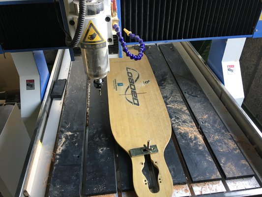 A tervem az volt, hogy az akkumulátor és a motor vezérlő tokozása két külön dobozban lesz, így a deszka közepe továbbra is vígan rugózhat. A két doboz között futó kábeleket mindenképpen el akartam rejteni, így a deszka gerincén martam nekik egy hornyot. Megadtam a módját. Gyakorlásnak pont jó volt, mint CNC marós feladat. A deszkát felfogtam a maróba, letapintottam a lap íveit. Hosszában felfelé ívelő „camber” profilja van, keresztben pedig nagyon enyhe U-profil. Az előbbi a rugalmasságot hivatott szolgálni, az utóbbi a jobb irányíthatóságot. Miután digitalizáltam, programoztam rá egy nagyon alap kódot a hornyok marásához. Fával dolgozni sosem tartozott a kedvenceim közé. Egyszerű okból, ha elbaszod, nem tudod visszahegeszteni. A megoldás: nem kell elbaszni.