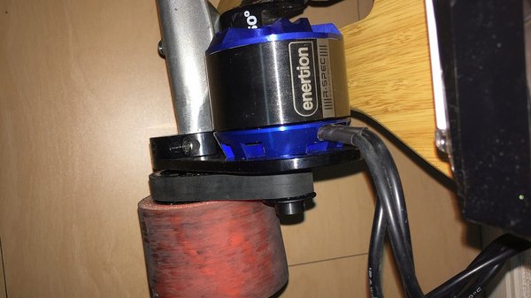 A motor az Enertion Skateboards-tól szereztem be. 3 kW. Eszement, teljesen felesleges teljesítmény, de nem volt viszonyítási alapom, gondoltam, ha a konkurencia 2 kW-tal gurít, jobb, ha az én deszkám is odébb bír majd állni. A modellezőknek ismerős lehet. Gyakorlatilag egy felizmosított BLDC Outrunner motor. Ez a kefe nélküli külső forgórészes motor rövidítése. Kicsit drágább volt, mint a sima modellezéshez használt hasonló motorok. Ezt azzal indokolták, hogy a csapágyazása erősebb, a kihajtó tengelye vastagabb és reteszhornyolt volt, nagyobb radiális terhelést viselt el, ami a szíjfeszítésből adódott a használat során.