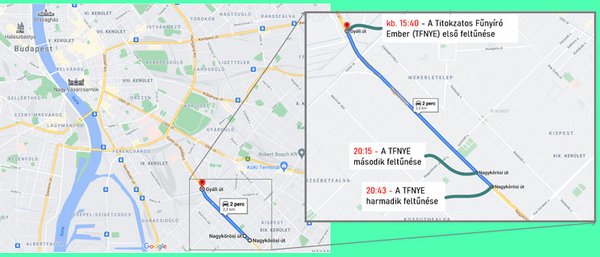 A poént a végére hagyom, hazafelé jövet, úgy 27 perccel később az embert ismét sikerült észrevenni a túloldalon, pont egy lámpa alatt volt, így egészen jól kivehető. Ha a fedélzeti kamera koordinátái pontosak, akkor újabb 220 métert halad előre, nem tudom, hányan kaptak közben a szívükhöz. Az látszik, hogy már fáradt egy picit, és romlott a nyírási sebessége, de így is gratulálnék, ha így halad, hamarosan Kecskemétre ér. A múltkor kipróbáltam, nem könnyű meló ám ez, nehéz és hangos a gép, meg vibrál is. Az is megeshet, hogy nem is ugyanaz a fickó volt, de ettől függetlenül: biztosan így kell a füvet lenyíratni?