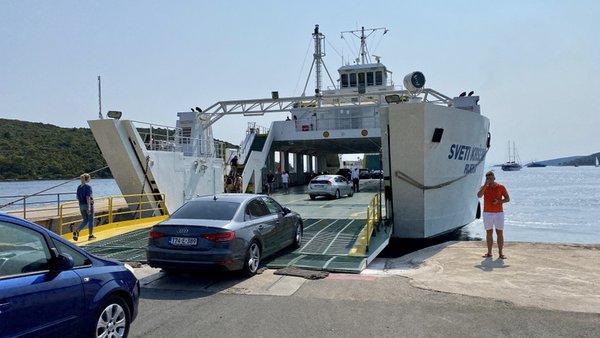 Az autót az éjszaka folyamán a 230 V-os hálózatról 79%-ra sikerült feltöltenünk 22%-ról, így a tervezett 200-250 kilométeres táv könnyen teljesíthetőnek tűnt, de a biztonság kedvéért nagyon spórolósan indultunk neki, és a légkondit sem használtuk egész nap, pedig nagyon jó idő volt. Fél tízkor indultunk el a Korcula melletti kompkikötőbe, ahol kis várakozás és egy újabb kávé után kihajóztunk Orebić irányába. Dodótól, aki búvárkodásban és hajózásban is profi, megtudunk minden érdekességet az alattunk lévő gépészetről. A kompon villanymotorok hajtják a Voith Schneider propellereket, melyek tulajdonképpen függőlegesen forgó, szárnyprofilú lemezek, állásszögük változtatásával terelik megfelelő irányba a hajtóerőt, így kormánylapát sem kell. Kettő van belőlük, egy a hajó elején, egy pedig a végén, rengeteget segítenek a manőverezésben, a balatoni kompok is hasonlóan működnek. Az áramot kétütemű dízelmotorok szolgáltatják, melyek nehézolajjal működnek.