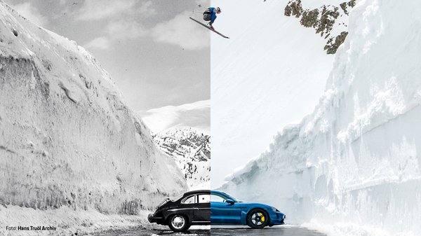 Ezt a több mint hatvanéves képet alkották újra egy kék Porsche Taycannal és Aksel Lund Svindal többszörös olimpiai- és világbajnok síversenyzővel. Szerencsére még mindig akadt akkora hófal az út mellett, hogy sikerüljön a modern kori változat.