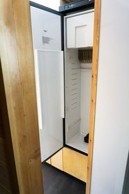 És tágas. A lakóautózás/lakókocsizás megkíván némi tengeralattjárós vagy harckocsis vonzalmat, már ami a szűk helyeken való életet érinti. Ez sem az a tágasság, amit nagypolgári lakásokban érezni, de nyaraló szinten teljesen oké: a zuhanyzó nem olyan, mint Drakula koporsója, a wc-n ülve szét lehet hajtogatni egy rendes újságot, a lakórészen pedig a nagy belmagasság és az üvegfelületek miatt kimondottan jó a térérzet. Az emeleten egy kényelmes franciaágy van, lent pedig az asztalt elhúzva ki lehet hajtogatni egy másik kétszemélyes ágyat. A tűzhely, a hűtő, a kazán, vagyis a gépészet egyébként lakóautós vonalról származik, ugyanazok a beszállítók, mint a Hymernél vagy úgy általában az összesnél.