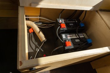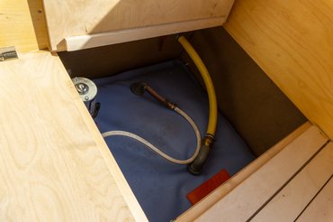 Nem véletlenül, a Tiny House-okat jellemzően közmű nélküli helyekre rakják le, önellátónak kell lennie. A víz egy 400 literes tartályban van a padok alatt, egy fakkal arrébb laknak az akkumulátorok, ezek teljesen átlagos hajós munkaakkuk, a négy darab összteljesítménye 400 Ah, és az egész 12V-os rendszer, a klasszikus konnektorokat inverterrel oldották meg, így simán tölthető a laptop vagy a telefon. Erről egy hétig tud menni minden - mármint olyan nagyon sok minden nem, hiszen lényegében csak a világítást és a gázrendszer ventilátorát kell meghajtania, minden más gázról megy, a fűtés, a melegvíz és az abszorpciós hűtő is. Ugyanis a gáz a legolcsóbb energiahordozó, és Norbiék direkt fejlesztettek hozzá egy mobil LPG palackot. A fűtés és a szigetelés alkalmassá teszi téli üzemre, olyankor a hidegtől függően 20-30 ezer forint a havi gázszámla.