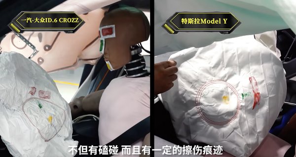 Az utasvédelmi eszközök rendben működtek. A légzsákon a Teslában nem pont középre érkezett a bábu feje, a VW-ben igen. Mindkét autóban találkozott a térd a műszerfal aljával, itt is a Teslánál volt rosszabb a helyzet.