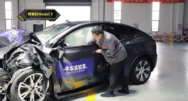 A Model Y vezetőoldali ajtaja kézzel nem volt nyitható, mert a hátrafelé mozduló zsanéroktól összefeszült. Karambol után csengő füllel, szédülve, sokkosan, zúzódásokkal átmászni egy másik ajtóhoz nem valami jó móka. Az A-oszlop (az első szélvédőoszlop lába) megrogyott és hátra mozdult, és több helyen megroppant a tetőív héja is. A küszöb felnyílt és meggyűrődött. Ami a legrosszabbul néz ki: a padlólemez és az aksi takarólemeze is hullámosra deformálódott, azaz tekeredett akkorát a karosszéria egésze, hogy mindent elhúzott. Mindezekkel együtt is sértetlen maradt az utascella, de nagy kérdés, hogy még 10 - 20 km/h esetén mit láttunk volna.