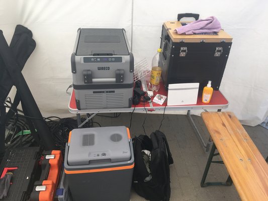 A nyári események igen melegek voltak, így felvonultattam teljes hűtőkészletem, a Crivit és a Waeco láda fej fej mellett küzdött a 38 (betonon inkább 40) fokokkal, a kollégák örömére. Persze a kompresszoros nyert, csodák nincsennek, sajnos a peltier elemes megoldások (és jellemzően az abszorpciósok többsége is) elvérzik 30 fok fölött, de azért ilyenkor a 15 fokos víz is jól tud esni. Na meg a minden eseményünkön jelenlévő Szomjoltók hűsítő zuhanya.