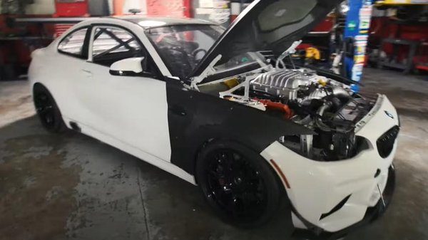 410 lóerős turbós sorhatosával a BMW M2 Competition egy remek sportkupé, amivel már bőven lehet sietni versenypályán is. Az elvetemült autóépítés viszont nem ismeri az optimumot, ezért az sem meglepő, hogy simán helye van a kipakolt M2-esben egy Hemi V8-nak.