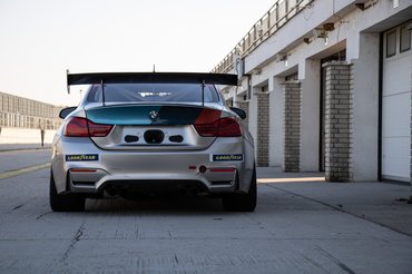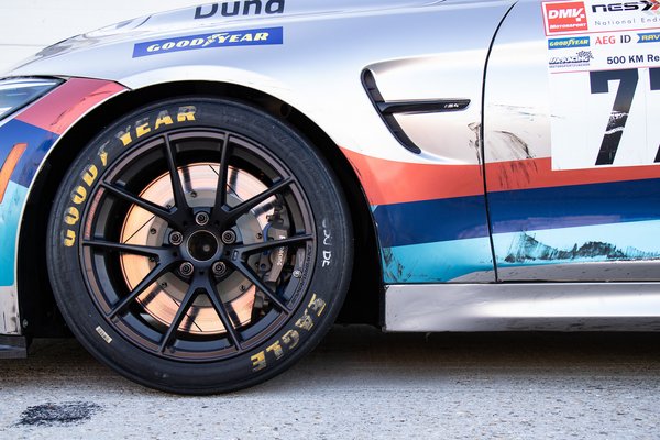 Mindig jó érzés ilyen célgépet látni, ami ennyire közel van az utcai változathoz. Kicsit a DTM aranykorára vagy a brit túraautó bajokság autóira emlékeztet, hogy a BMW M4-esből egy egészségeset ültető futómű és néhány aerodinamikai elem mennyire megváltoztatja az autó kiállását. A GT4-esek között az M4-es egy súlyos személyiség és egy váratlanul testes bódé, ami leginkább akkor látszik, amikor elsuhan mellette egy viccesen aprónak és laposnak ható Porsche Cayman GT4. Karbon tetőpanelje van, szénszálas a gyorszáras motorháztető és az ajtói. Ennek ellenére alapból 1480 kiló az M4 GT4, aztán beleül a versenyző, telecsorgatják a 125 literes tankot, és máris több mint 1,6 tonnával kell repeszteni a pályán.