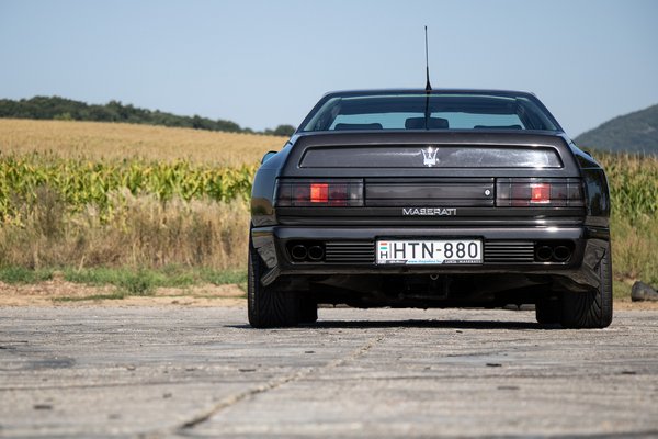 Jól mutatja, hogy valójában mennyire kis autó is a Shamal, hogy négyülésesnek hívják, de még mögöttem sincs egy milliméternyi lábtér sem hátul, de beszédes az is, hogy mindenhol kilóg alóla a technika. Az első lökhárító alatt megvillan a blokk, hátul pedig a kipufogódobok között ott az olajhűtős Torsen sperr, amit a Maserati Ranger differenciálműnek keresztelt.