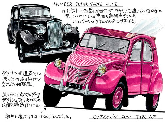 Minden, ami eddig elhangzott, a 2CV-nek ágyazott meg, ezt a rendezőtárs és szintén gépbuzi Yasuo Otsuka fejtette ki egy interjúban, ő egyébként az autós üldözésekben gazdag, európai árnyalatú Lupin III sorozatért felelős (nem pontosan idézem): Miyazaki műfajtól függetlenül szereti a gépeket. Szereti a repülőgépeket, a tankokat, a hadihajókat és a mechákat, ez a külsős munkáin (pl. az illusztrációs esszé és mangagyűjteményén) is látszik, ám ezekben csak ritkán fordulnak elő autók. Inkább a régimódi gépezeteket szereti látható csavarokkal és anyákkal, azokat, amelyek a második világháború előtt készültek, nem pedig ezeket a fényes és áramvonalas [modern] darabokat.