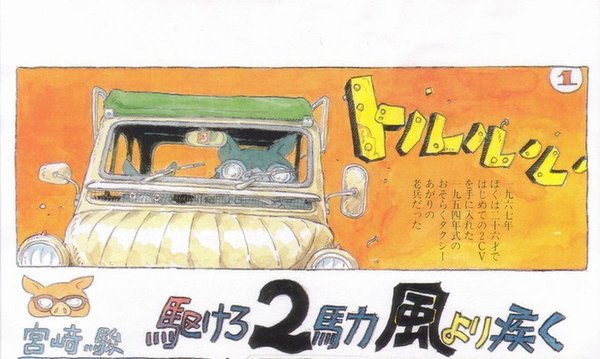 Miyazaki azután vette meg az első autóját, hogy 1967-ben felvették a Toei Animationhöz. Gyereke lett, muszáj volt. Kollégái ekkortájt Subaru 1000-esekkel, E10-es/E20-as Corollákkal és Prince Skyline-okkal jártak - nagyrészt “a japán autó első évének" köszönhetően - , de őt nem érdekelte különösebben a fősodor. Ezt csak tetézte, hogy Louis Malle “Les Amants” című filmjében látott egy 2CV-t, ám mivel Japánban a közember csak nehezen juthatott importáruhoz, az európai autókra tekeredett Otsuke barátjához fordult segítségért, hogy keressen neki egy Citroënt.
