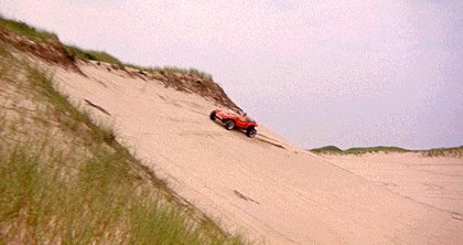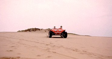 Az eredeti Thomas Crown ügy másik sokat szereplő autója a Meyers Manx buggy volt, amely külön jelenetet kapott - ez arról volt híres, hogy a tengerparti csapatást nem kaszkadőr csinálta, hanem a súlyos autóbuzi McQueen. De McQueen nem csak vezette, hanem a tervezésében is benne volt. Az alapot ugyanis fel kellett dobni, hogy látványosabb legyen, ehhez pedig a terepversenyzésben és autóépítésben utazó Pete Condos segítségét kérték, aki McQueennel közösen találták ki, milyen legyen az autó. Így kerültek fel a buggy-ra a custom lámpák, a lapos szélvédő, a szélesített küszöbök és a fotelszerű ülések, illetve dobták ki a VW motort, és csavarozták a helyére a Chevrolet Corvair léghűtéses, hathengeres boxerét. Valószínűleg a 2,7-es, turbós változatot, mert állítólag a buggy 230 lóerős és kb. 500 kilós volt. Mind a két értékkel kapcsolatban szkeptikus vagyok - a teljesítményt még könnyebben elhiszem, hiszen a legerősebb Corvair 180 lóerejét nem olyan nagy dolog 230-ra húzni, viszont az 500 kiló túlzottan szálkásnak tűnik, egy Honda Gold Wing is 390 kiló, és lényegesen kisebb, mint bármilyen buggy.