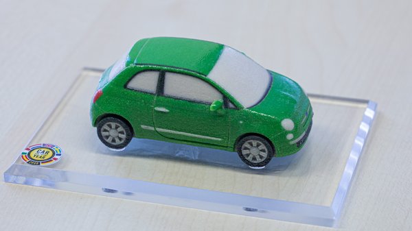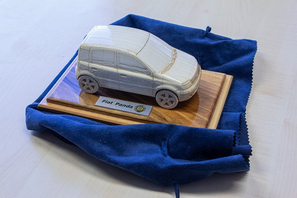 Az illető jármű a 2004-es Év Autója, a Fiat Panda volt, amiről azt találták ki a Fiatnál, hogy nem az egyik, vagy másik nagynevű modellgyártótól rendelnek a zsűritagok számának megfelelő darabot, hanem azt, hogy maguk gyártják le. De nem is csak úgy akárhogy, hanem egy akkor új technológiával, papírlapokból összeragasztott tömbből, lézerrel vágják ki a kisautó makettjét. A művelet sikerült, az eredmény a képeken. És, ha már így belejöttek, pár évvel megismételték a mutatványt. Amikor az új Fiat 500 elnyerte a 2008-as Év Autója díjat, abból is hasonlóképpen faragtak makettet. Csak sokkal kisebbet, és ki is festették!