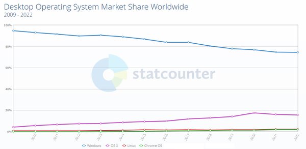 - A Google-nek nincs egy népszerű, asztali operációs rendszere. Bő 20 év alatt az Apple-féle MacOS egy megkerülhetetlen rendszerré fejlődött, az angolszász területeken sok cégnél és munkakörben a Windows-zal szemben elsöprő előnye van, de a világ minden táján gyorsan terjed és nagy rajongótábort tud magáénak, ráadásul még így sem harap ki többet a piac 20%-ánál, miközben a Windows stabilan 70% fölött van, mindig.