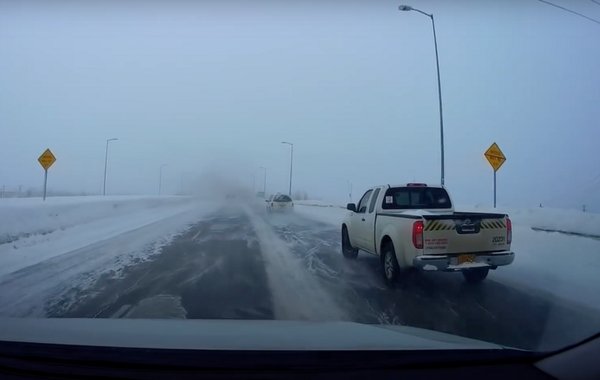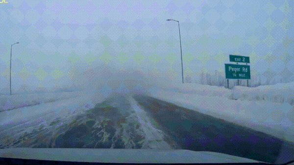 Az alaszkai Fairbanks melletti autópályán vett fel tanulságos képsorokat egy fedélzeti kamera: a félhomályos, havas úton normál tempóban halad a forgalom, majd egy átlátszatlan sűrű füstfelhő előtt szavazzák meg maguknak a bizalmat a bátrabbak, köztük a felvételeket készítő autós is.