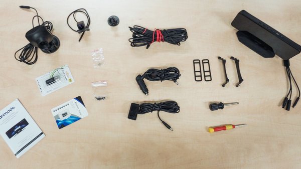 Viszonylag kicsi a doboz, mégis úgy ugranak elő belőle a tartozékok, mint nyulak a kalapból. Kapunk egy nagy kijelzőt, két kamerát, mindenféle tappancsos és ragasztós talpat, szivargyújtós és OBD-II-es tápkábelt, végtelen mennyiségű vezetéket, csavarokat, szerszámokat, de még egy külön becsomagolt 128 GB-os microSD-t és egy USB-s kártyaolvasót is.