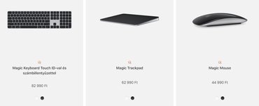 Az új kiegészítők között egyébként fekete Magic Trackpad és Magic Mouse is szerepel, 63, illetve 45 ezer forintos áron, a szintén fekete, ujjlenyomat-olvasóval és numerikus segédbillentyűzettel szerelt klaviatúra pedig 83 ezer forintért vihető haza.