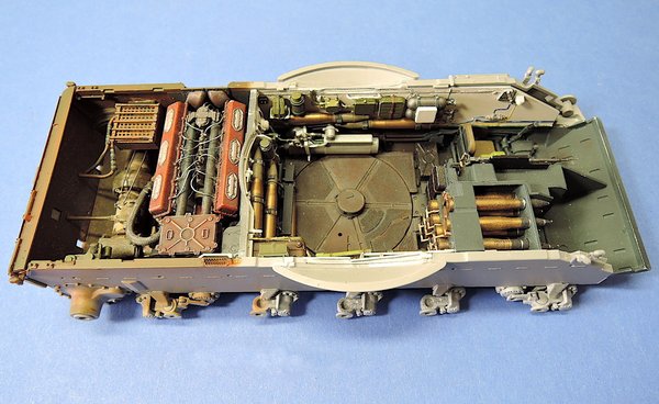 Az ágyú annyiban is modernebb, mint a T-55-ösé volt, hogy automata szerkezet tölti be a lőszert, nem pedig egy katona, így a Tifon 2a személyzete egy fővel kevesebb, négy helyett három lehet. A töltési sebesség 8 lövedék percenként, ami emlékeim szerint körülbelül a leggyakorlottabb töltőkezelők szintjén áll. A leggyorsabbak ugyanis körülbelül 7 másodperc alatt képesek az összes, töltéssel járó feladatot – ágyú rögzítése, lövegzár nyitása, hüvely kiemelése, hüvelyszáj ronggyal letakarása, hogy ne füstölögjön, a következő (körülbelül 40 kilós) lőszer kiemelése a tárból, majd behelyezése az ágyúba, lövegzár bezárása, ágyú rögzítésének feloldása – elvégezni.