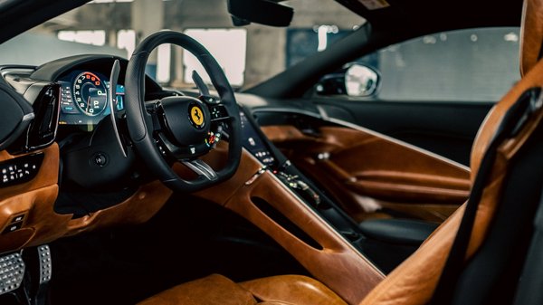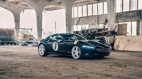 Ott figyel a 7-es rajtszám a skót nemzeti színekbe öltözött Roma oldalán, az utasterében pedig antik hatású bőrkárpit, a Heritage Mahogany Reddish Brown hozza vissza a Ferrari gran turismo-inak aranykorát.