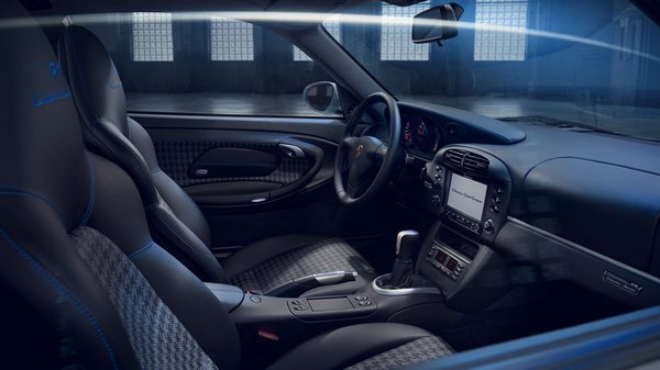 Utasterét fekete bőrbe varrták, a tetőkárpit pedig Alcantara, az ülések középső része - és az ajtókárpitok is - fekete és palaszürke bőrből szőtt retró pepita mintás, a fejtámlákban kék 911 Classic Club Coupe felirattal. Látszik, hogy a legapróbb részletekig kitalált autó lett a 996-os, az egész végtelenül stílusos, még az ötórás műszeregység fordulatszámmérőjének számlapja is az autó színeit viseli. Korhű megjelenésű, de modern a Porsche Classic Communication Management Plus hét hüvelykes kijelzője, mely Apple CarPlay-t és Android Auto funkciót is tud, alatta pedig két USB csatlakozót is kialakítottak.