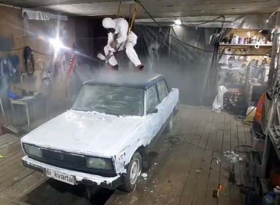 Emberünk a kocka Lada fölött lóg a festékszóró pisztollyal, mondjuk a kocsi eleve úgy néz ki, mint amit korábban már meggyaláztak, de az is biztos, hogy a főhősnek fogalma nincs róla, hogy mit csinál éppen, teljesen kontrollálatlan az egész mozdulatsor.