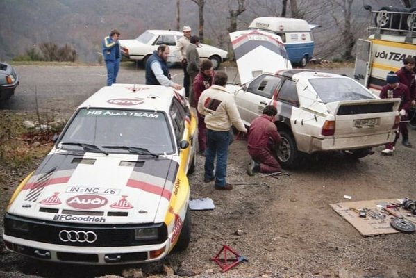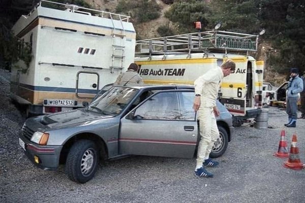Ezek a képek egy 1985-ös Monte Carlo-i teszten készültek, azokon a szakaszokon próbálgatták a technikát, ahol a Porsche Macan T-t is vezettem. Itt azonban felbukkan az öthengeres, összkerékhajtású Audi Quattro rövid változata. Aztán megérkezik Walter Röhrl egy szürke Peugeot 205 T16-tal, mely a franciák válasza volt a kategóriára.