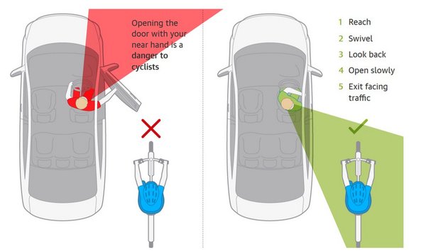 Az autóban ülőknek az ajtót az ajtóval ellentétes oldalon lévő kezükkel kell kinyitniuk, és a fejüket elfordítva a válluk fölé kell nézniük. Ez az arrafelé Dutch Reach néven ismert technika csökkenti annak az esélyét, hogy az ajtót a kerékpárosok és a motorkerékpárosok útjába nyissák.