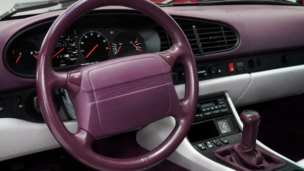Igaz, ez a 968-as meglehetősen csinos darab a padlizsán fényezésével és a fehér-lila kombinációjú beltérrel. A vakítóan szép üléskárpitok sorozatos Porsche felirata is elég jellegzetes részlet, ekkoriban felbukkantak hasonló mintázatok az utastérben.