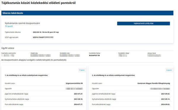 Ha nincs pontunk, akkor értelemszerűen nem kapunk további információkat, de a kiszabott pontokról mindig látjuk, hogy mikori szabálysértés tartozik hozzá, és mikor évül el. Örömteli, hogy ez az ügymenet is megérkezett a 21. századba.