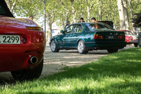 Nagyszerű látvány a BMW Classic 3.0 CS-e és Z8-asa (megsúgom, ezekről lesz szó később) mellett az Alpina B12 és az M5 Nürburgring csomaggal. Sokáig az E34-es nekem csak egy 5-ös BMW volt a sorban, de mostanra egyre gyakrabban nézegetem, mint potenciális veteránt, amiben megvan a régi BMW-k bája és a jól használható hajtás. V8-as is van belőle, de annyira sorhatossal az igazi, hogy az M5-ben is az van, itt az S38B38 kódú 3,8 literes, hengerenkénti pillangószelepes motor 340 lóerővel. Elegáns Laguna zöld metál fényezés és világos bézs bőrkárpit kombinációjával nem csoda, hogy elvitte a youngtimereknek járó trófeát.