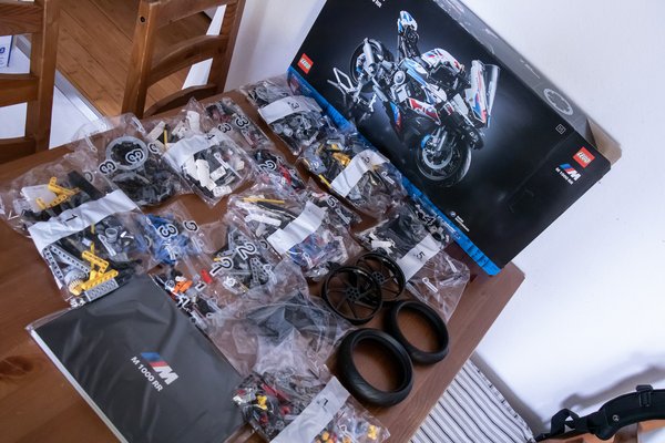 Komolyságot sugall már a fekete hátteres doboz, amin hatásos fotó és színben passzoló kockák grafikája üzeni, hogy ez itt a felső polcos Lego Technic készlet. Mert az 1949 óta műanyag játékokat gyártó dán vállalat rájött, hogy messze nem csak gyerekek körében népszerű elfoglaltság kockákat és más elemeket összepattintani, hanem a felnőttek is szeretik az ilyesmit. Autókból már régóta vannak egyértelműen exkluzívabb készletek, mint a Porsche 911 GT3 RS vagy a frissen bejelentett Ferrari Daytona SP3, de minden idők legösszetettebb motoros Legoja csak az M 1000 RR-rel érkezett meg.