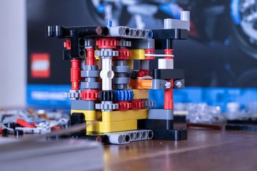 Háromsebességes váltója adja a motor legmasszívabb tömbjét, ehhez csatlakozik majd két oldalról a többi nyúlvány. A nyitott váltóházba sorra kerülnek be a forgó elemek, pálcikák, különböző méretű fogaskerekek és más furcsa alakzatok, néhányat még gumiszalaggal is össze kell kötni, hogy valóban működjön. Amikor már a négyhengeres blokk is összeállt a főtengellyel és a dugattyúkkal, valamint az arany szemekből összeállított - ebben az esetben szintén gondozásmentes - lánc is felkerül, rendesen öröm nézni a pucér hajtást. Érdemes ilyenkor próbálgatni és megérteni a működését, mert jó érzés, továbbá ahogy rákerülnek az idomok és más esztétikai elemek, már nem lesznek ennyire szem előtt a mozgó, színes alkatrészek.