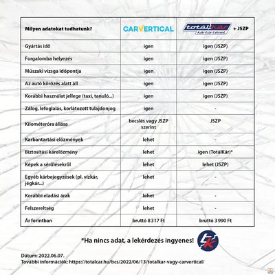 Az alábbi táblázatban éppen ezért a Carvertical jelentését a JSZP és a TotálKár rendszereiből nyerhető adatokkal vetjük össze: