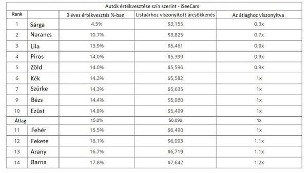 Az iSeeCars az autók három év alatti értékvesztését vizsgálta, szín alapján váratlan eredmények jöttek ki: a legnépszerűbb árnyalatok (ezüst, fekete, fehér) az átlagnál jobban veszítenek az értékükből, a lista eleje és vége pedig a következőképpen alakul: legjobban a sárga, a narancs és a lila, legrosszabbul pedig az aranyszínű és a barna autók teljesítenek.