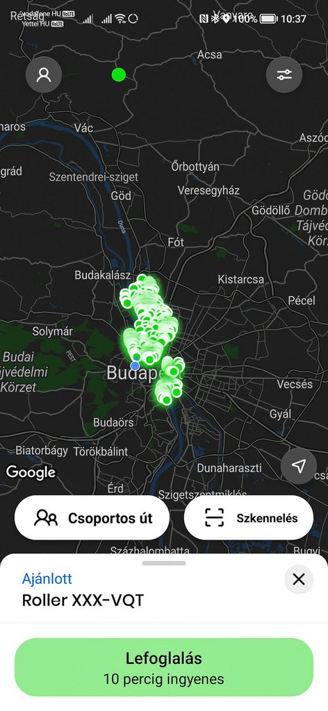 Lehet indítani csoportos utat egyszerre legfeljebb 5 kibérelt rollerrel, az app nagyon egyértelműen mutatja, hogy mely területek nem használhatók, hol vannak a rollerparkolók, az adott rollereket megérintve pedig nem csak az látható, hogy mennyire van feltöltve a gép, és mennyi a várható hatótávja, hanem azt is, hogy mennyi ideig kell sétálni hozzá. Az alapcsomagban 10 percre előre foglalhatjuk le ingyenesen a rollert, elindulásnál pedig egy QR-kódot kell szkennelni, ami által biztossá válik, hogy azon a rolleren állunk, amit lefoglaltunk.