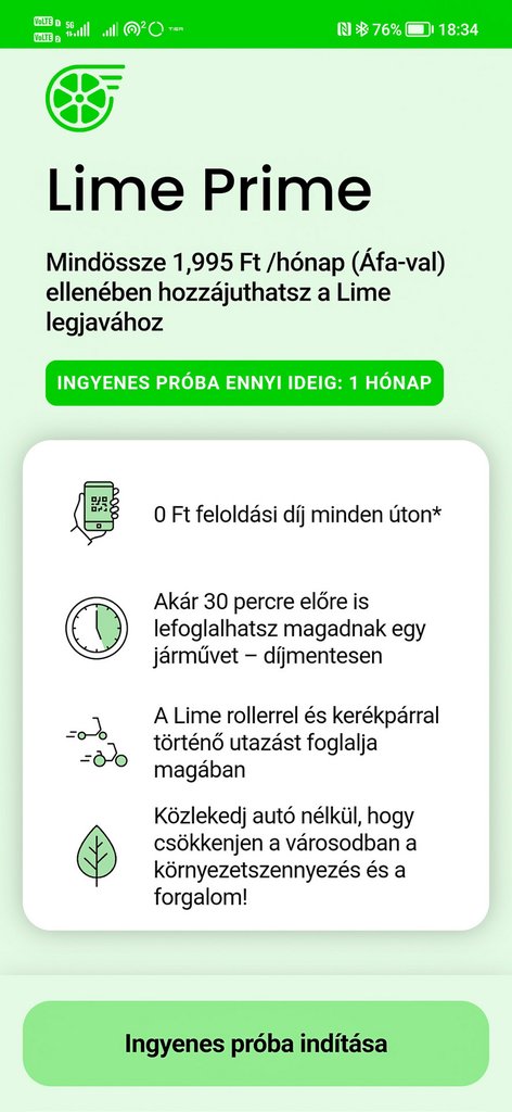 A Lime Prime-csomag havi 1995 forintba kerül, ebben 0 forintos feloldási díj és 30 perces, ingyenes előre foglalási lehetőség van, aki havi nyolc alkalomnál többet használná a rollert, annak megérheti, illetve nem szabad elfelejteni, hogy van egy 750 forintos letét is, amit minden induláskor lefoglal számlánkról a rendszer.