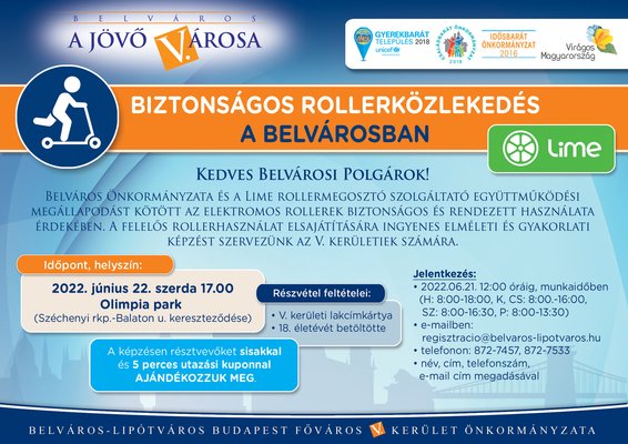 Ma délután 5-kor tart egy ingyenes elméleti és gyakorlati képzést az V. kerület önkormányzata, partnerként pedig a legnagyobb, itthon is működő rollermegosztó cég, a Lime lesz segítségükre. A biztonságos rollerközlekedésre felkészítő elméleti és gyakorlati képzés ingyenes, a résztvevők 5 ajándék Lime-percet és egy bukósisakot is kapnak, de a részvétel előzetes regisztrációhoz kötött, és csak az V. kerületi lakcímkártyával rendelkező, 18. évüket betöltött embereknek szól.