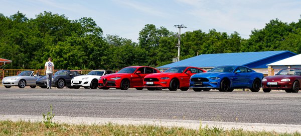 A Pályautózz képzésének a lényege, hogy kevés ember vesz részt rajta, így bár a program csak egy délelőttön át tart, mindenki elég időt tud tölteni az oktatóval. Mi hatan érkeztünk, két MX-5, két új Mustang, egy Alfa Giulia QV, valamint egy Porsche Boxster. 110-től 510 lóerőig tehát mindenkinek osztanak lapot, tévedés lenne azt gondolni, hogy csak erős autóval érdemes nekivágni egy ilyen képzésnek. Mielőtt felhajtottunk a pályára, még ki kellett tölteni egy pályarajzot, vagyis berajzoltuk az elméleti képzés alapján általunk ideálisnak vélt ívet. Aztán javítottuk szinte mind.