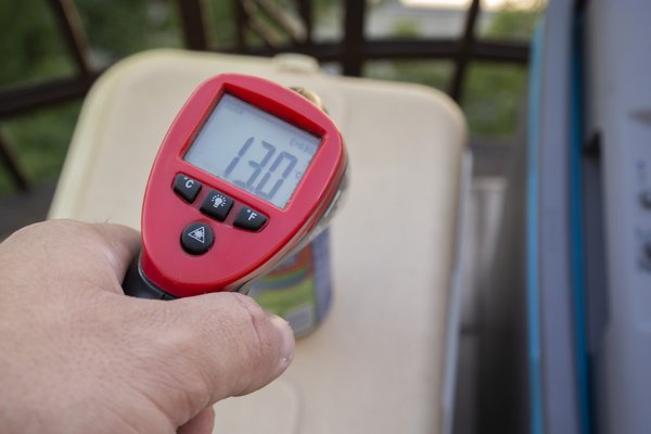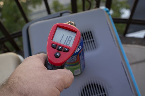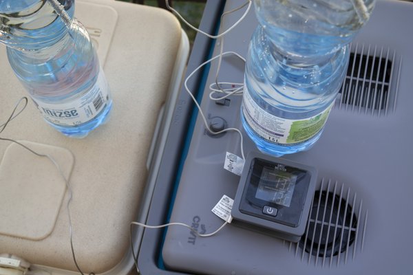 Papp Tibi korábbi tesztje alapján biztos voltam benne, hogy a hűtőláda el tudja érni, hogy bekapcsolt állapotban, 30-35 Celsius fok körüli külső hőmérséklet mellett megtartsa a 10 fokos italok hőmérsékletét, így elsősorban arra voltam kíváncsi, mennyire engedhetjük el a jégakku intézményét csupán azért, mert egy jól szigetelt, és bekapcsolható hűtéssel szerelt ládánk van. Más szóval: mi történik akkor, ha a melegben hagyjuk magára a ládát, kikapcsolt állapotban. Referenciaként elővettem az ezeréves hűtőládánkat, amibe négy darab jégakkut raktam, és azt szimuláltam, hogy a Lidl-féle aktív hűtőláda két órányi utazás alatt tovább hűti az azonos hőfokról indult italokat, utána viszont együtt árválkodnak a melegben. Egy darab 9 Celsius fokos, 0,5 literes sört és egy darab 13 Celsius fokos, 1,5 literes ásványvizet tettem mindkét táskába, a külső hőmérsékletet lézeres hőmérővel, a víz konkrét hőmérsékletét pedig egy grillhőmérővel ellenőriztem.
