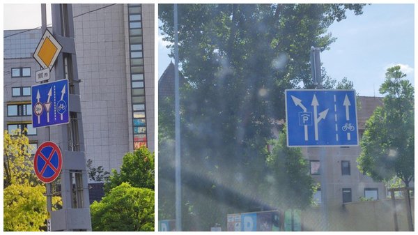 A leggyakoribb esetben a busz- és kerékpársávokat jelzik előre, jóval hamarabb és megbízhatóbban a lekopott felfestéseknél (ez például itt egy közös busz- és kerékpársáv):