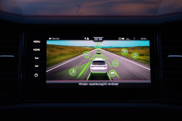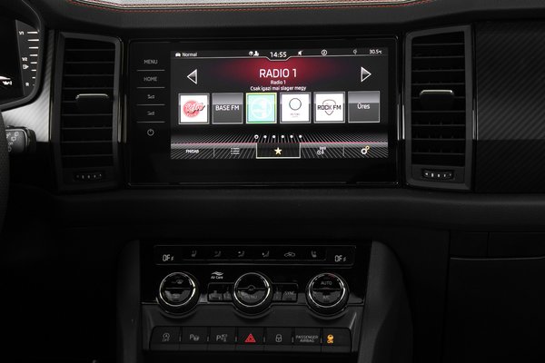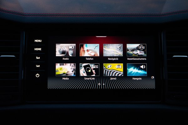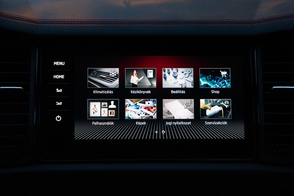 A Kodiaq RS rendszere még a régebbi kezelőfelületre és operációs rendszerre épít, viszont funkciók terén az évek során ebbe is szinte mindent belepakoltak, és egy olyan üdvözlendő állapot állt elő, ahol még nagyon sok mindent kezelhetünk fizikai gombokkal, de már megvan a vezeték nélküli mobilos összeköttetés, a távolról küldhető OTA szoftverfrissítések és a folyamatos internetkapcsolat.