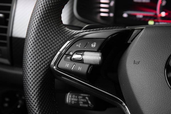 A kormányon megvan a hangerő-tekerő, a számléptetés és a hangvezérlés gombja, ezen kívül a parkolóradart kikapcsolni és az önálló parkolást bekapcsolni is gombbal lehet, nem kell hozzá bemászni a menübe. A kijelző mellett a drágább változatokon kapacitív érintőgombok vannak, az olcsóbb, kisebb kijelzős modellek mellé még befért a középső hangerőtekerő is.
