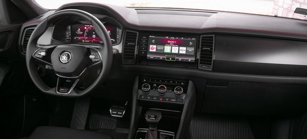 A legkomolyabb felszereltségű Kodiaq a sofőr előtt 10 hüvelykes kijelzővel szerelt digitális műszerfalat kap, középen pedig gesztusvezérlésre is alkalmas, 9,2 colos központi kijelzőt lehet látni – igaz, megtévesztők ezek a számok, nettó képernyőfelület szempontjából valójában a középső a nagyobb, mivel a műszeregységet helyettesítő panel lapos, de széles, középen pedig hagyományosabb arányú, így kisebb képátló mellett is nagyobb a területe.