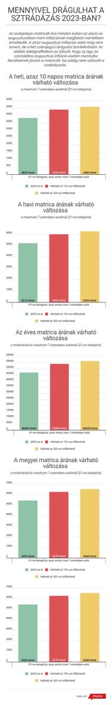 Ez azt jelenti, ha nem történik a sztrádamatricák szabályozásában változás az év végéig, akkor két számjegyű drágulás várható. Ahogy szó volt róla, az augusztusi infláció még nem ismert, csak szeptember 8-án közli a Központi Statisztikai Hivatal (KSH), ezért csak hozzávetőlegesen lehet megmondani a 2023-as árakat. A Totalcar készített erre egy becslést, mégpedig 15 és 20 százalékos drágulást feltételezve. Az eredmények az alábbi képen látható adatgrafikán szerepelnek.