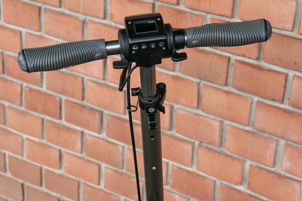 Hiszen ez három méterről pontosan ugyanúgy néz ki, mint egy filléres Kugoo S1 Pro, én legalábbis biztosan fizetnék egy sört annak, aki ilyen távolságból százból százszor, bármilyen szögből eltalálja, melyiket látjuk éppen. Egy teljesen hagyományos rollerváz, sárvédős fék, tömör gumik, leforduló markolatok és állítható magasságú kormányrúd a szokásos apró, benyomós pozíciópöcökkel, amihez hasonlóval tíz év kihagyás után találkoztam újra.
