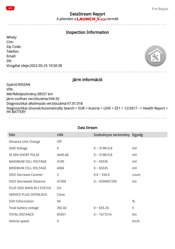 Megbeszéltük Istvánnal, hogy elkanyarodik felénk, és kiolvassuk a telepen álló, 2018-tól gyártott, második generációs Nissan Leafek komputerét. Az eredmény mindkettőnk számára sokkoló volt, hiszen a műszerfalon jelzett szám csupán töredékét mutatta a belső komputerben jelzett értékeknek mindkét autó esetében. Az egyik meghirdetett Leaf órája 38557 km-t jelzett, miközben a kiolvasás TOTAL DISTANCE (teljes távolság) névre keresztelt rubrikája 85951-et. Ha ez még nem lett volna elég, jöttek a további lesújtó sorok: ODO DECREASE COUNTER: 2 (csökkentések száma), ODO DECREASE DISTANCE (csökkentett távolság) 47394 km.