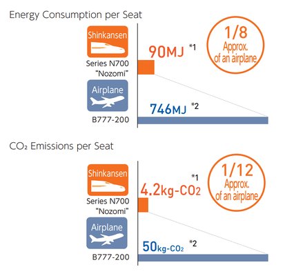 Időben ez már a regionális légitársaságok territóriuma, főleg, hogy külvárosi reptér helyett belvárosi állomásról indul a szerelvény. Óriási marketinges fór, hogy eközben a környezetbarát kártyát is ki lehet játszani: azonos távon a hagyományos sinkanszenre (N700, Nozomi) ülésenként 4,2 kilogramm széndioxidot számolnak, míg egy Boeing 777-200-esre ugyanez 50 kiló; a vonatközlekedés az ország kibocsátásának 6 százalékáért felel, miközben az utazások 30 százalékát bonyolítja le. Az SCMaglev közvetett emissziójáról egyelőre nincsenek pontos adatok, de az energiaigényét a hagyományos sinkanszenek két-háromszorosára becsülik, ami legrosszabb esetben is harmada a repülők igényének. Mellette szól még, hogy tiszta energia esetén a kibocsátása nulla, de a Daiicsi atomerőmű balesete óta kevés nemzet látja árnyaltabban ezt a kérdést a japánoknál.